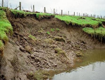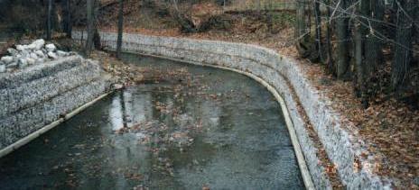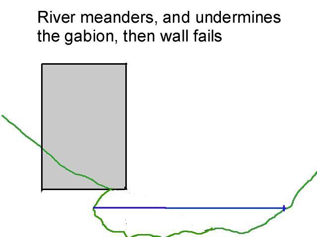 Gabion baskets placed on the outside of the river bend to prevent river bank erosion during floods. Geotech filter fabric is placed behind and underneath the gabion baskets to prevent the movement of soil material through the gabions.