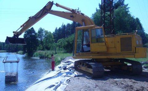 Machine and hand filling gabions, is often possible to avoid having to divert the river with a bund