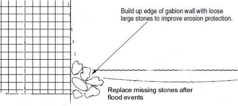Placing large rocks, at the base of the gabion, provides added erosion protection. These rocks may need to be inspected and replaced after flood events