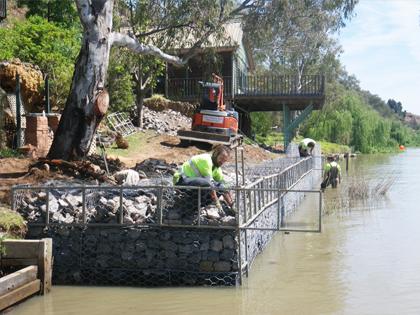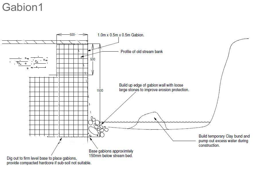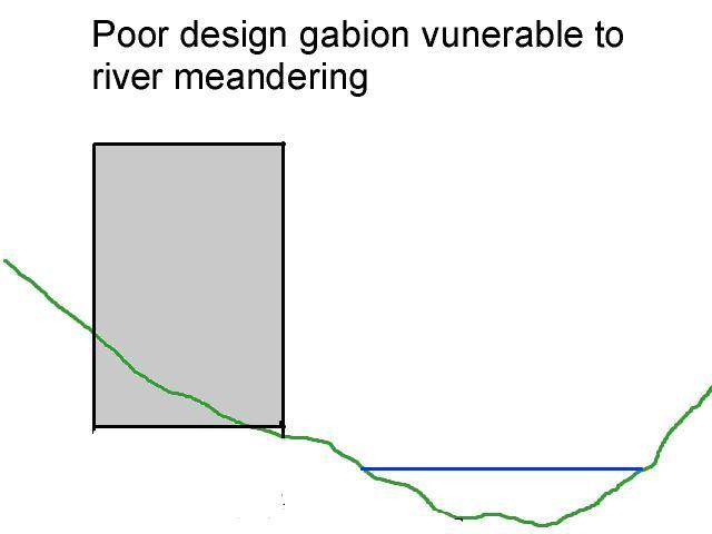 Gabion flood projection must be designed to cope with peak river flows often referred to to as 1 in 50yr, or 1 in 100yr floods. This often requires larger gabion walls and foundations, than envisaged. An engineer is able to examine historical weather data, and design for the expected flood events over the life time of the wall.