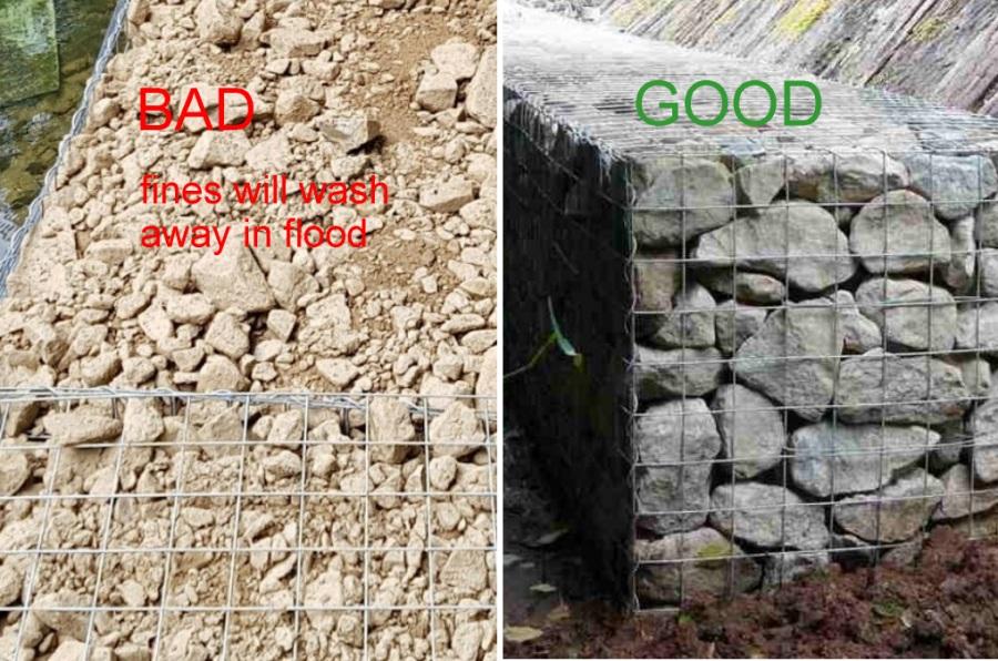 In locations where high flood water velocities are expected, carrying woody debris and gravels in suspension, the stronger 4ga or 5ga welded gabions are the preferred choice, to resist damage to the gabion structures during floods.