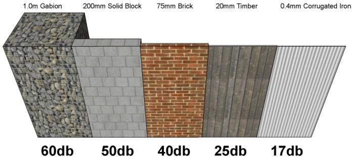 Noise from heavy trucks is around 85db. The denser the wall the more noise it stops, a 100% solid timber fence will only stop 25db of noise, the remaining sounds passes through. The gabion noise barrier wall stops the most direct road noise.