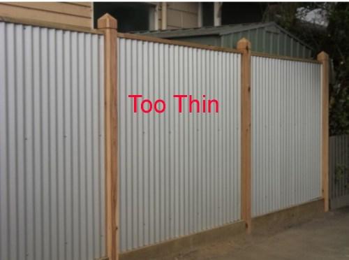 The corrugated iron fence, is so thin that more than 80% of road noise from a large truck will pass straight through the fence. Not a good noise reduction fence.