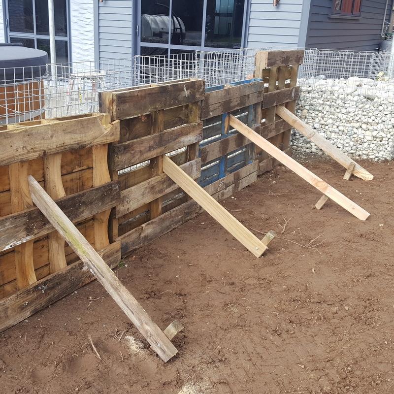 Gabion held in place by bracewire attached to the 2″ x 4″ frames